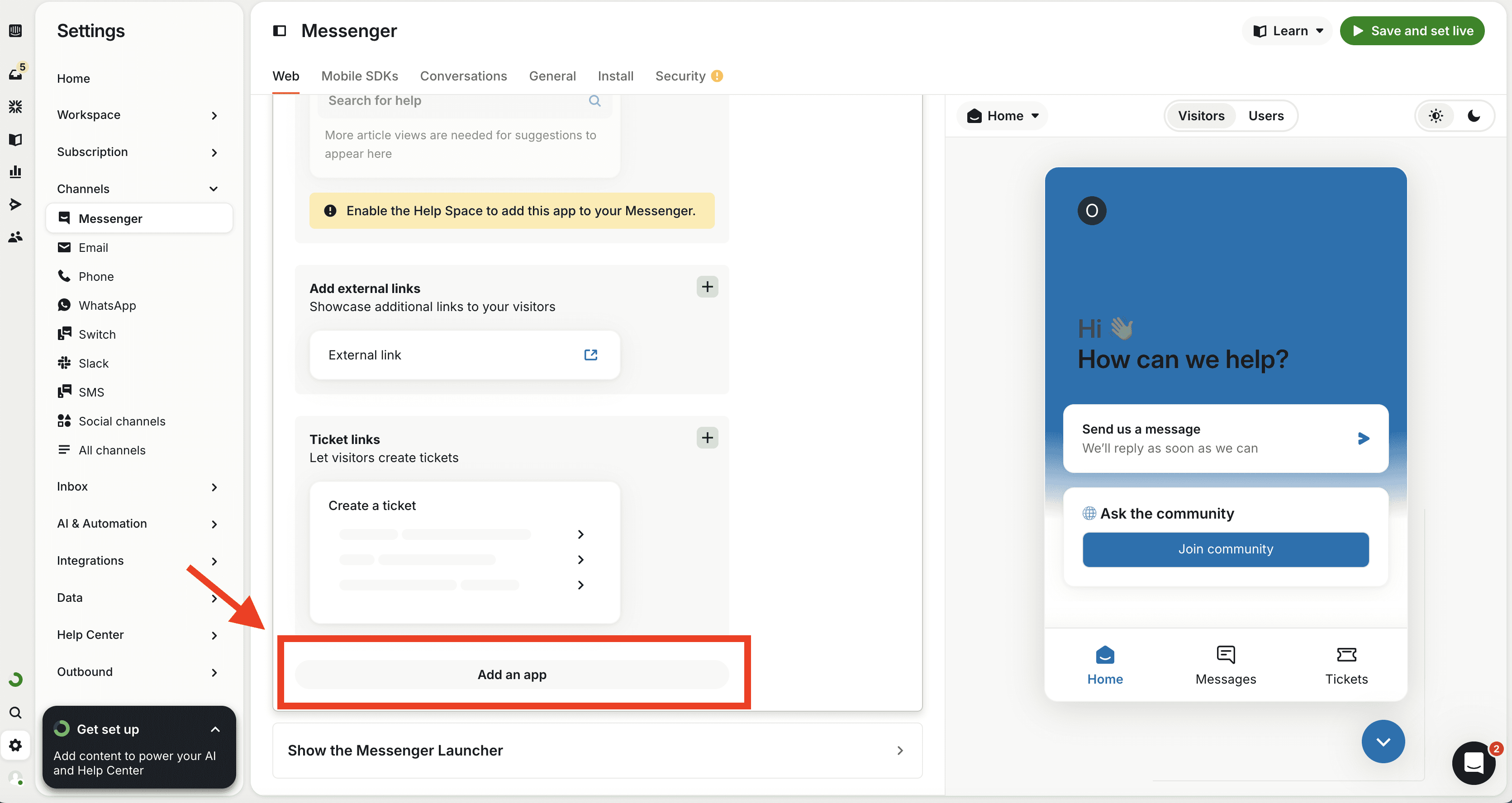 Intercom's Messenger allows you to customize the home screen with apps from its marketplace. After installing Turf's community platform, navigate to your Messenger settings and select "Customize Home with apps." From there, add the installed "Turf: Community forum" app to make it visible to users as soon as they open the messenger.