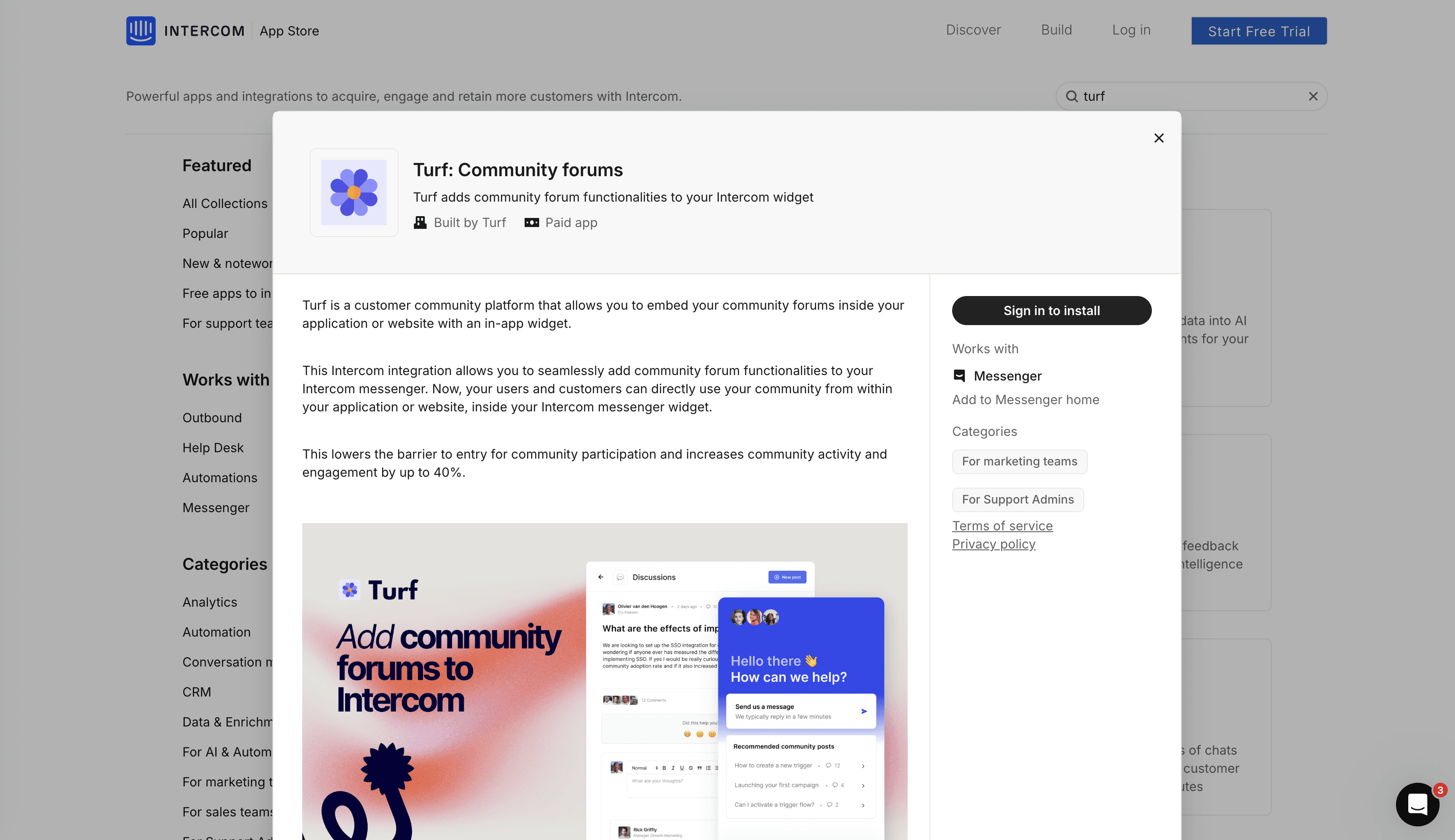 The most straightforward way to add community forums to Intercom is through Turf's official integration, available in the Intercom App Store. This integration allows you to embed a fully-featured community forum directly inside your Intercom messenger, so users can browse discussions, create posts, and engage with other customers without leaving the chat window.