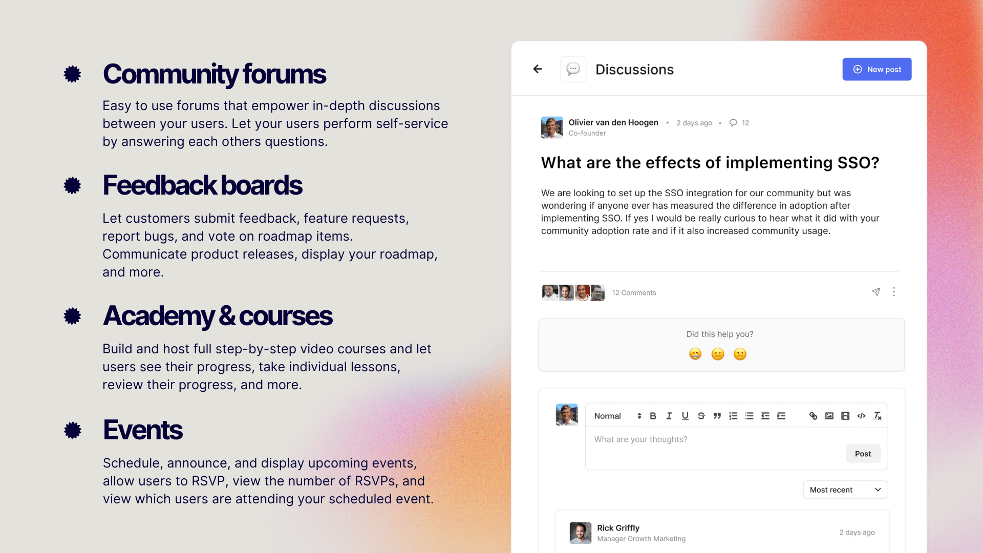 SSO also helps you restrict access to specific user segments or app customers, ensuring privacy and relevant segmentation for your community discussions.