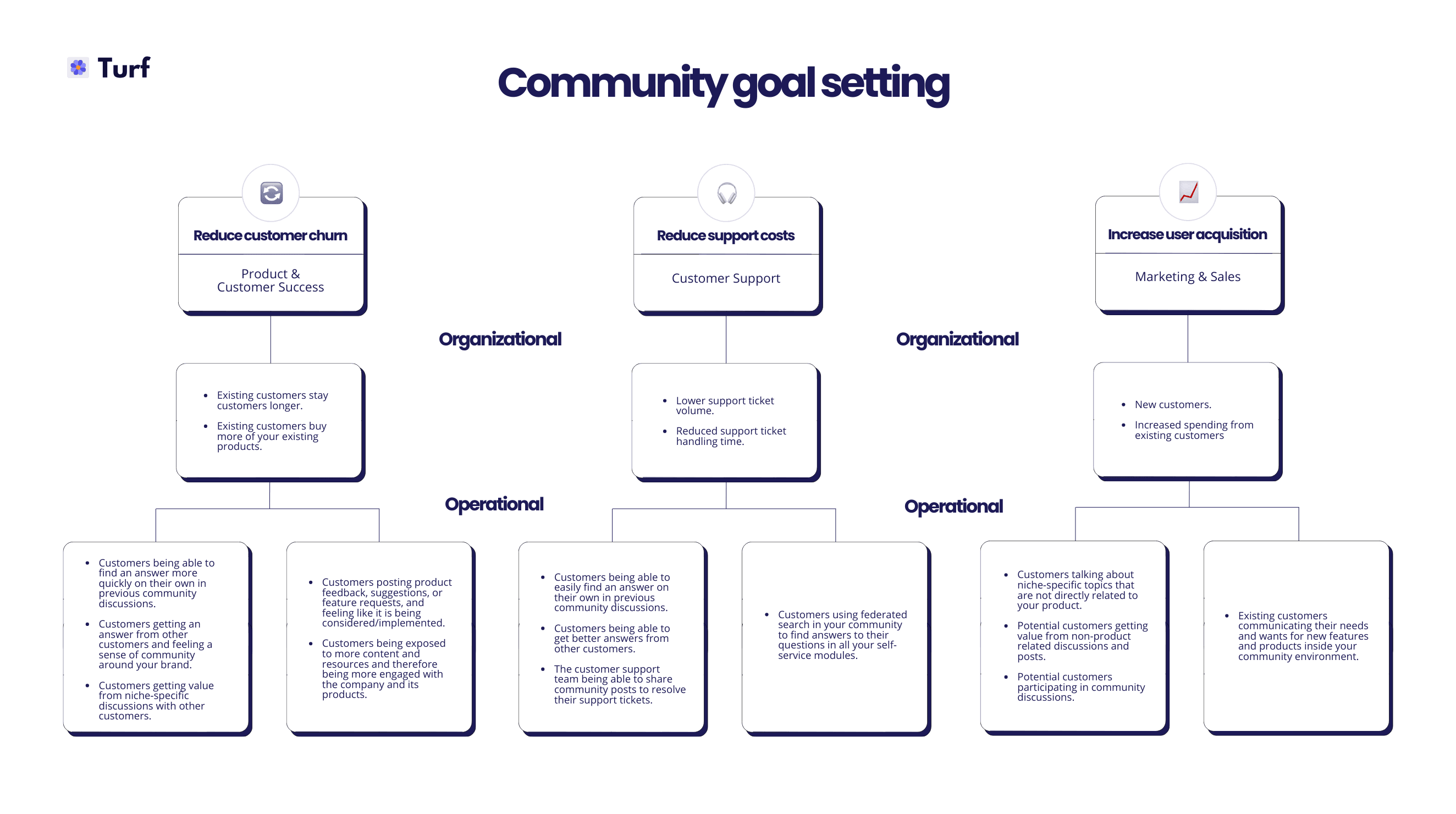 On a community operations level your goals are cultivating specific member behaviour. What type of member behaviour you need, to achieve the organisational level goal, is something that you need to identify and test for your specific customer base. Here is an overview of member behaviour examples and the organisational level goals that they serve:
